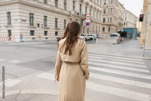 Fototapeta premium back view of woman in trench coat walking on street of european city.