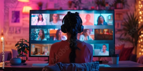 Obraz premium Back view of woman participating in virtual conference via video call, with multiple participants on the large monitor. Room is dimly lit, with neon lighting