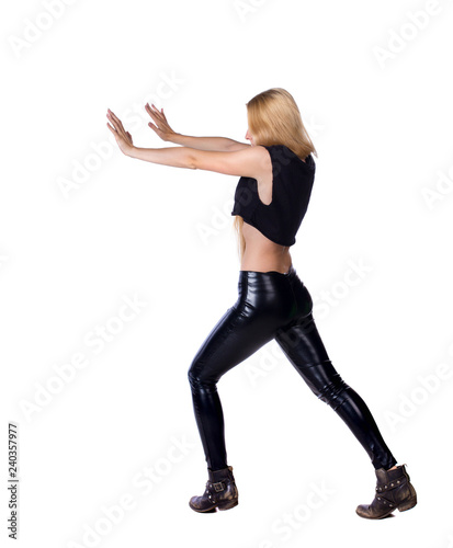 © ghoststone, Fototapeta premium back view of woman pushes wall