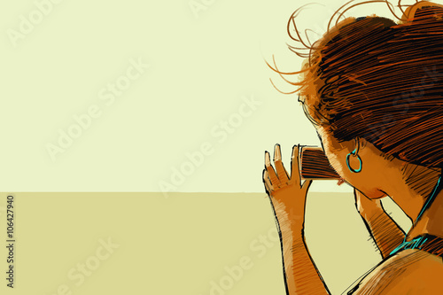 © grandfailure, Fototapeta premium back view of woman taking photo,illustration painting