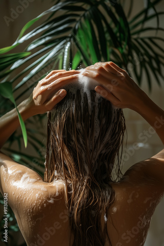 © Denis, Naklejka premium Back view of woman washing hair with shampoo in shower or bathtub against natural exotic blurry background. Hygiene and spa concept.