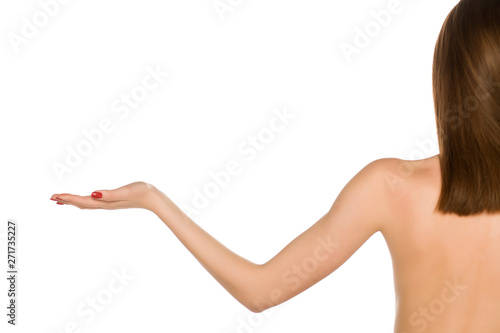© vladimirfloyd, Obraz premium back view of woman with outstretched hand on white background
