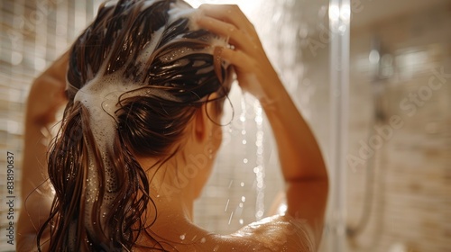 © Gasspoll, Naklejka premium Back View of Woman with Wet Hair Lathered in Soap in Shower
