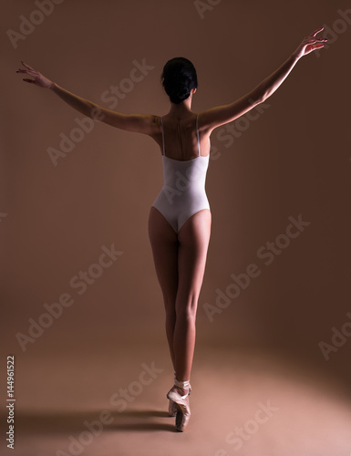© Di Studio, Obraz premium back view of young beautiful woman ballet dancer posing on toes over beige