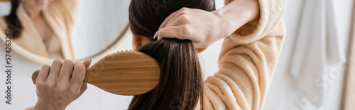 © LIGHTFIELD STUDIOS, Obraz premium back view of young brunette woman brushing hair in bathroom, banner.