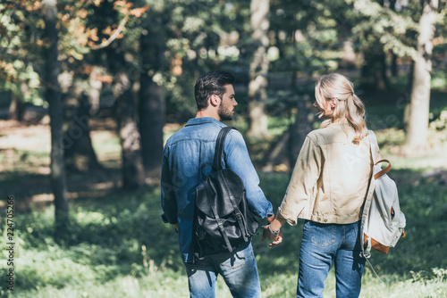Fototapeta premium back view of young couple with backpacks walking in autumn park