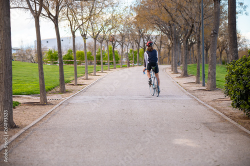 Obraz premium Back view of young male cyclist in sportswear and protective helmet cycling bike on road in park