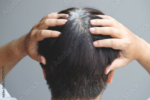 © methaphum, Naklejka premium Back view of young people premature gray hair, showing black hoary hair roots on head change to senior old man outdoor.