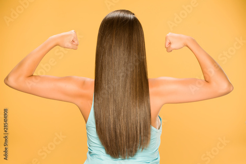 © vladimirfloyd, Naklejka premium Back view of young woman with long hair, showing her hands on yellow background