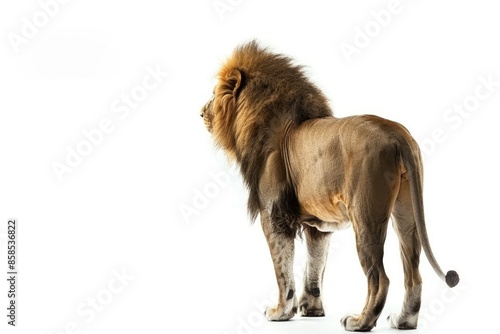 © darshika, Naklejka premium Back view on a male lion looking away isolated on white