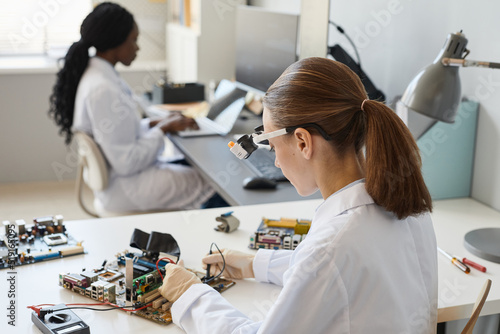 © Seventyfour, Fototapeta premium Back view portrait of female engineer working with hardware parts in laboratory, copy space