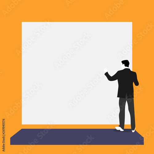 Obraz premium Back view young man dressed suit standing platform facing blank rectangle