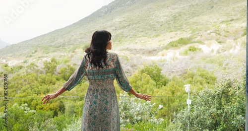 Obraz premium Back, woman and thinking on balcony at hotel for travel, scenic view and fresh air on holiday. Female person, vision or reflection and sightseeing on terrace, nature greenery and mountain on vacation