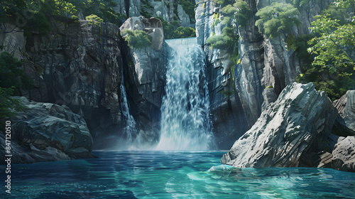 © Graphi Fusion, Naklejka premium Backdrop featuring a majestic waterfall cascading down rocky cliffs into a tranquil pool below