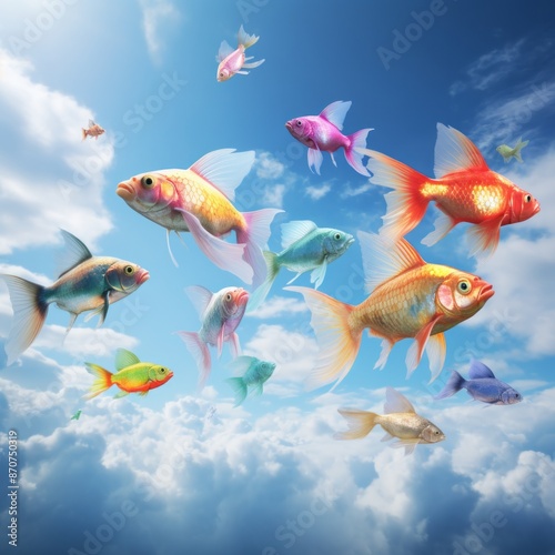 © tino, Fototapeta premium backdrop with blue sky and colorful flying fish , generated by AI. High quality photo