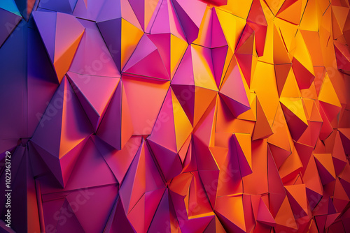 © Diana, Obraz premium Backdrop with contemporary abstract design featuring layered pink and orange triangles and geometric shapes. Modern geometry background. front view. Digital 3D render. wallpaper with texture.