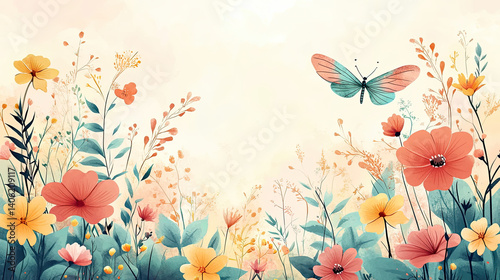 © Prime Lens, Fototapeta premium Background and banner decorated with pastel colors blooming flowers and leaves. Spring, Easter, Summer theme with dragonfly, butterfly and bee. Flat folk geometric style