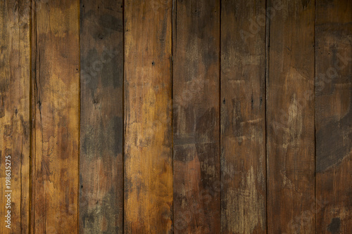 © Panupong, Naklejka premium Background and Wallpaper or texture of floor old brown hardwood or panels plank wood texture panel Vertically.