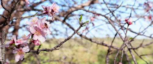 © tomertu, Obraz premium background banner of spring cherry blossoms tree and bee collects nectar from the flower. selective focus.