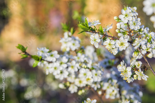 © alfaori, Obraz premium background blurred white blooming wild plum branches bright sunlit spring in May