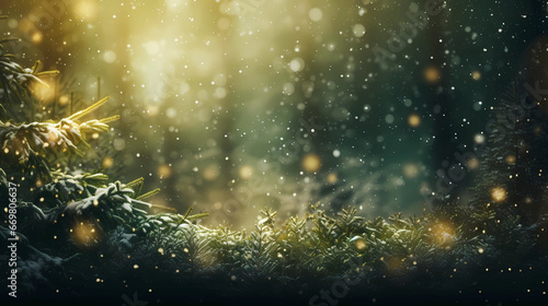 Naklejka premium Background Christmas Golden light shine, snow in forst, winter
