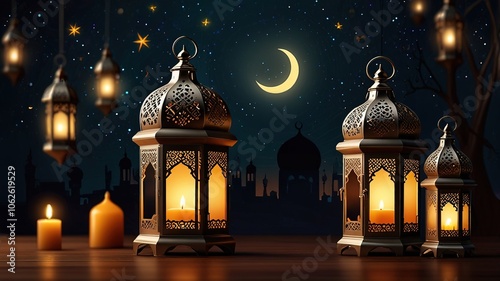 © Rusdin, Fototapeta premium Background design with ramadan theme, with illustrations lanterns