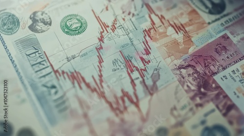 Fototapeta premium Background featuring a fluctuating stock chart, scattered banknotes, global currency symbols, and financial trends