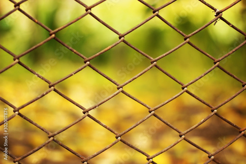 Fototapeta premium Background from a metal mesh. Grid on a background of greenery.