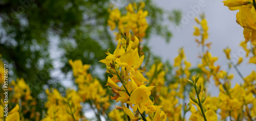 Fototapeta premium Background from yellow acacia flowers. The background is partially defocused. Bokeh Horizontal format. Banner.