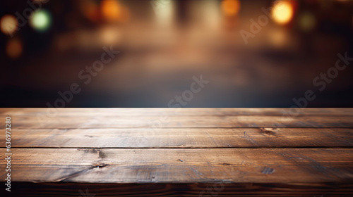 Obraz premium Background Image of wooden table in front of abstract blurred restaurant lights