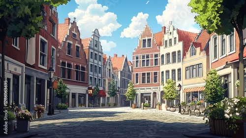 © DavoeAnimation, Fototapeta premium background layer of Belgian town square with quaint buildings and clear blue sky