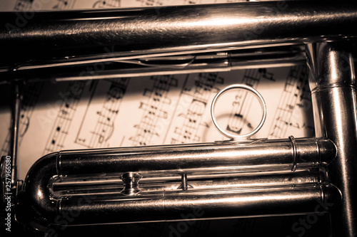 © Rick, Naklejka premium Background of a trumpet on sheet music