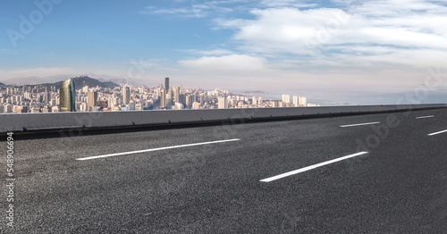 © zhouyilu, Fototapeta premium Background of asphalt pavement and urban architectural landscape skyline