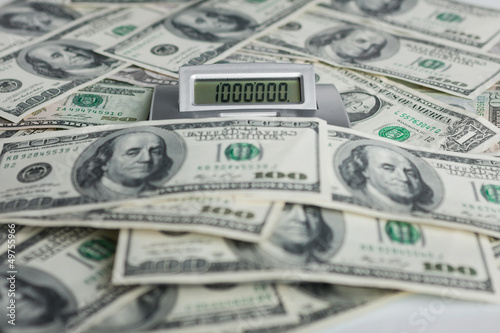 © alekleks, Fototapeta premium Background of $ 100 bills and a calculator