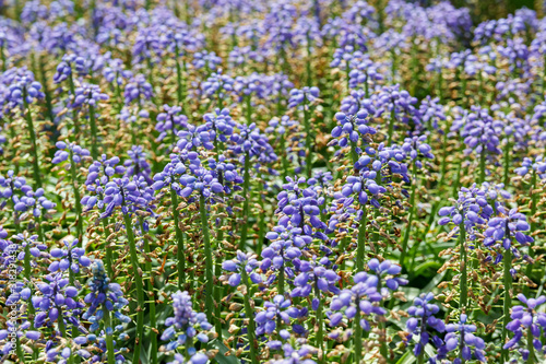 © A.J. Pedrosa, Naklejka premium Background of blue and green flowers on a sunny spring day.