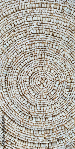 © Windi Holly, Fototapeta premium Background of circular pattern on ivory beads, up close. Traditional handicraft of ivory beads with circular pattern for decoration.