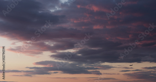 © GCapture, Obraz premium background of clouds on evening sky with bird and landing plane