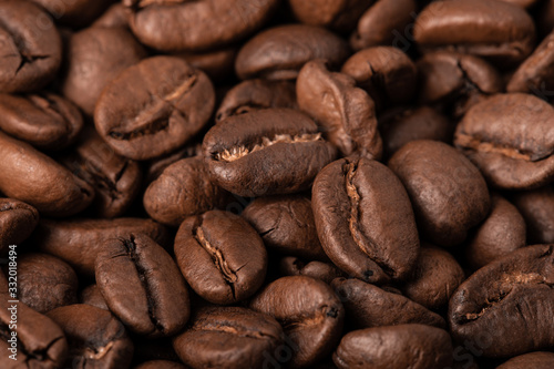 © Александр Маликов, Naklejka premium Background of coffee beans macro. Warm brown tones, the lateral scattered light.