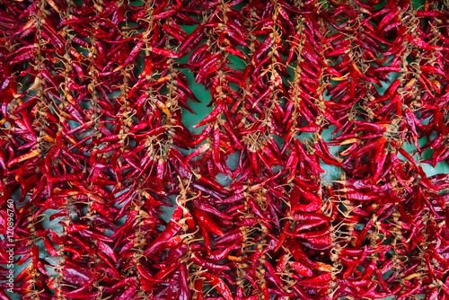 © yellowdays, Naklejka premium Background of colorful red and green bell peppers over wooden ba