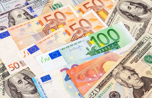 © Alexandr Blinov, Obraz premium Background of different currency. Euro banknotes and american do