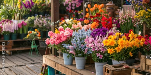 © Oulaphone, Fototapeta premium Background of different flowers on wooden table in the flower shop. Beautiful flowers for catalog or online store. Floral shop and delivery concept.