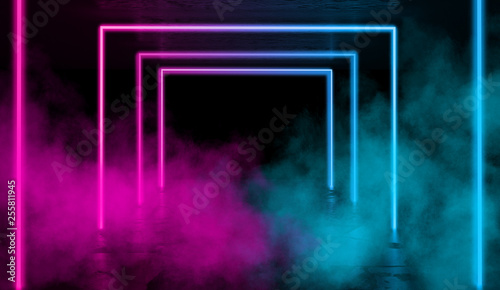 © Laura Сrazy, Fototapeta premium Background of empty room with concrete pavement. Spotlight light, multicolored neon light, reflection on tile. Laser lines, figures, smoke, smog
