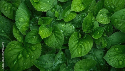 © The 2R Artificiality, Naklejka premium Background of green leaves with water drops, refreshing natural backdrop for eco-friendly themes