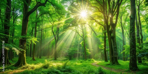 Fototapeta premium Background of lush green forest with sunlight filtering through the trees,...