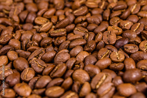© ihorbondarenko, Naklejka premium Background of many roasted coffee beans. Selective focus