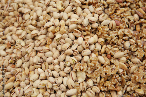 © Irina Tarzian, Fototapeta premium background of mixed pistachios and walnut. Smart food