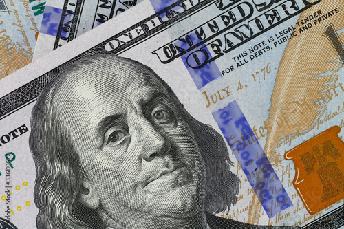 © Nataliia, Naklejka premium Background of money. Macro shot of a new 100 dollar bill. Close-up, horizontal, cropped shot. Concept of financial crisis.
