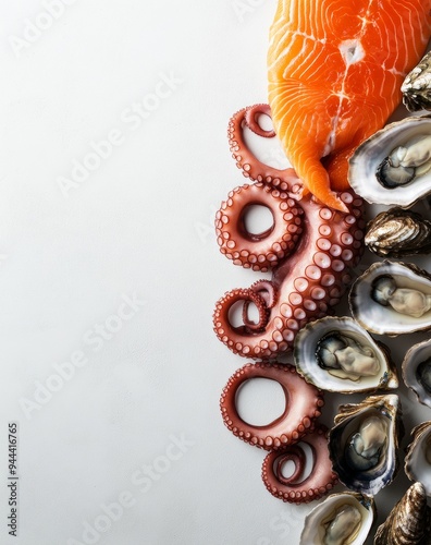 © lastfurianec, Fototapeta premium Background of octopus tentacles, salmon tail, oysters, Kamchatka crab claws with a space for copying in the center.