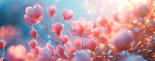 © LeManna, Fototapeta premium Background of the blooming pink flowers on sunset.