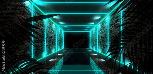 Fototapeta premium Background of the dark room, tunnel, corridor, neon light, lamps, tropical leaves. Abstract background with new light. 3D rendering